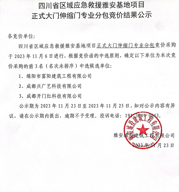 四川省區(qū)域應急救援雅安基地項目正式大門伸縮門專業(yè)分包競價結(jié)果公示