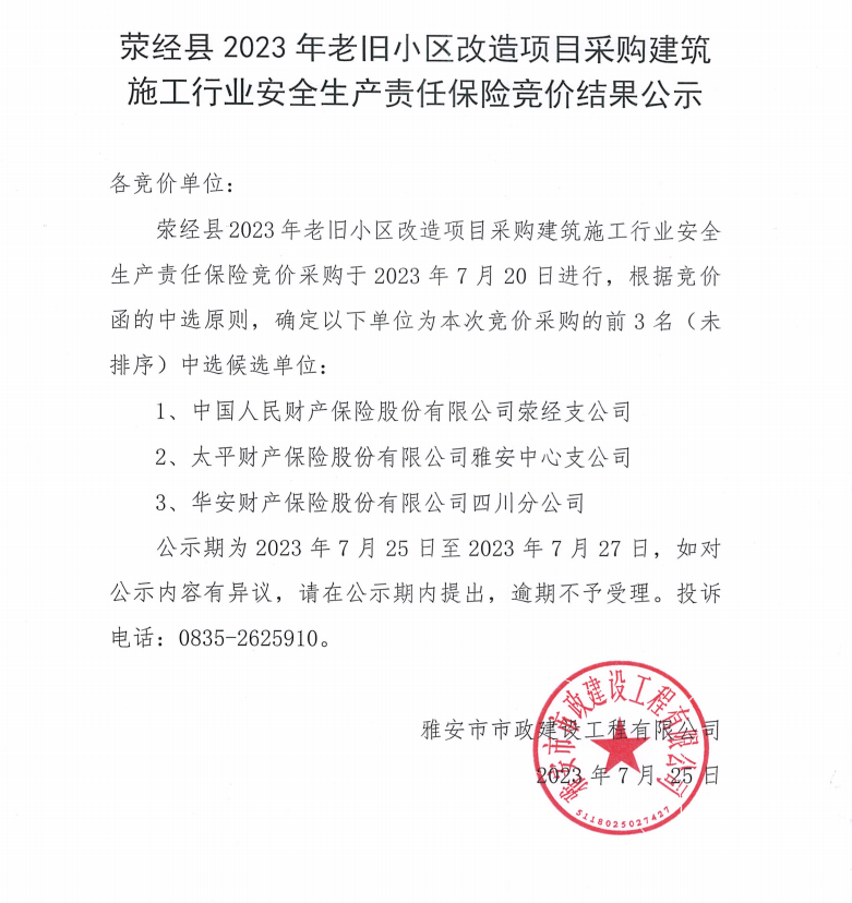 滎經(jīng)縣2023年老舊小區(qū)改造項目采購建筑施工行業(yè)安全生產(chǎn)責任保險競價結(jié)果公示