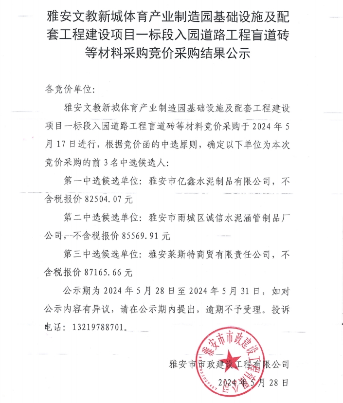 雅安文教新城體育產(chǎn)業(yè)制造園基礎設施及配套工程建設項目一標段入園道路工程盲道磚等材料采購競價采購結(jié)果公示