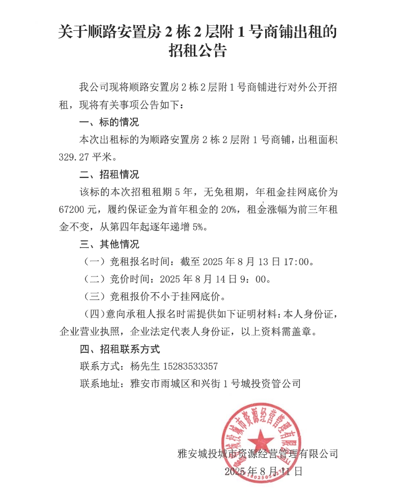 關(guān)于順路安置房2棟2層附1號(hào)商鋪出租的招租公告