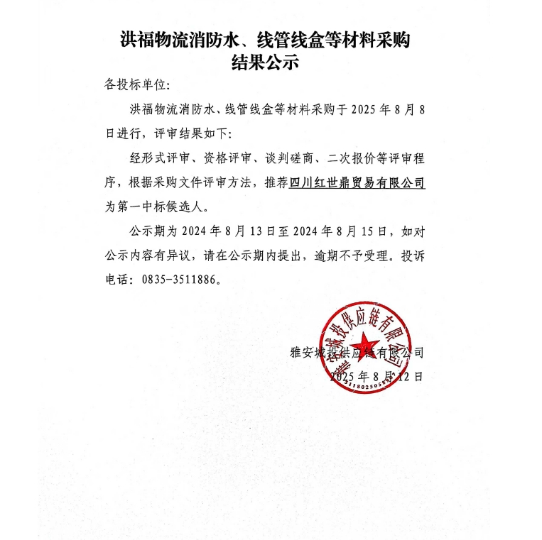 洪福物流消防水、線管線盒等材料采購結(jié)果公示