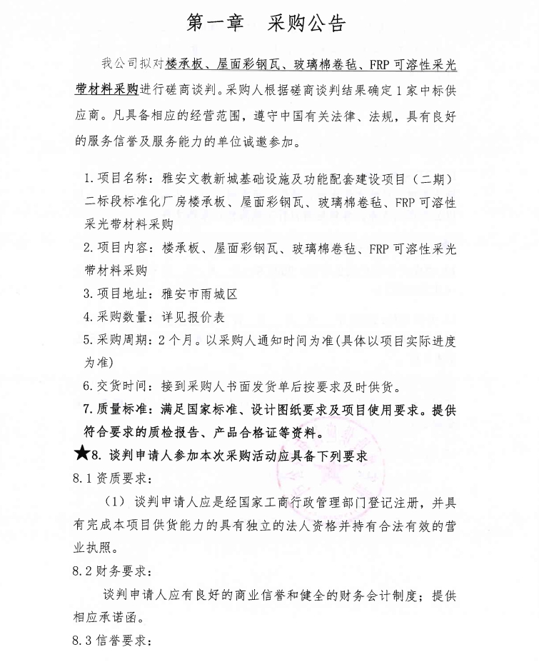 雅安文教新城基礎設施及功能配套建設項目(二期)二標段標準化廠房樓承板、屋面彩鋼瓦、玻璃棉卷氈、FRP可溶性采光帶材料采購公告